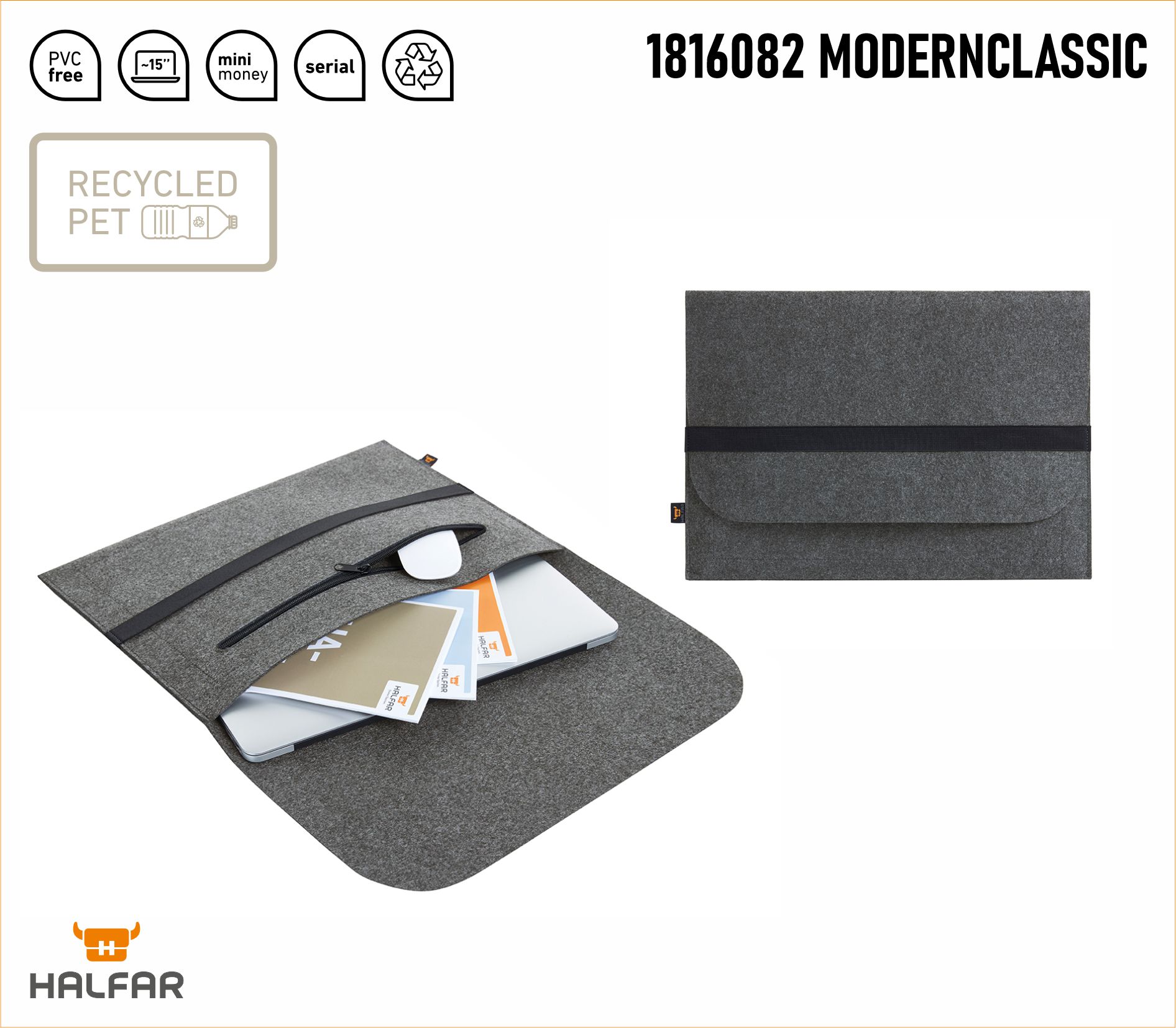 | Szefowie dużych firm mają biuro z frontową recepcją... Zgodnie z tą zasadą etui ModernClassic oferuje nie tylko stylową przestrzeń z filcu w kolorze antracytu na laptopy o przekątnej do 15,6 cala ale i frontową kieszeń na mysz, zasilacz, kabel oraz rzeczy takie jak długopis czy papier. Materiał: Filc z recyklingu Rozmiar:42x30/54,5 cm Pakowanie: 50 szt./karton Specyfikacja: wysokiej jakości filcowe etui na laptop; kieszeń z przodu na zamek błyskawiczny; elastyczna taśma do zamknięcia teczki |