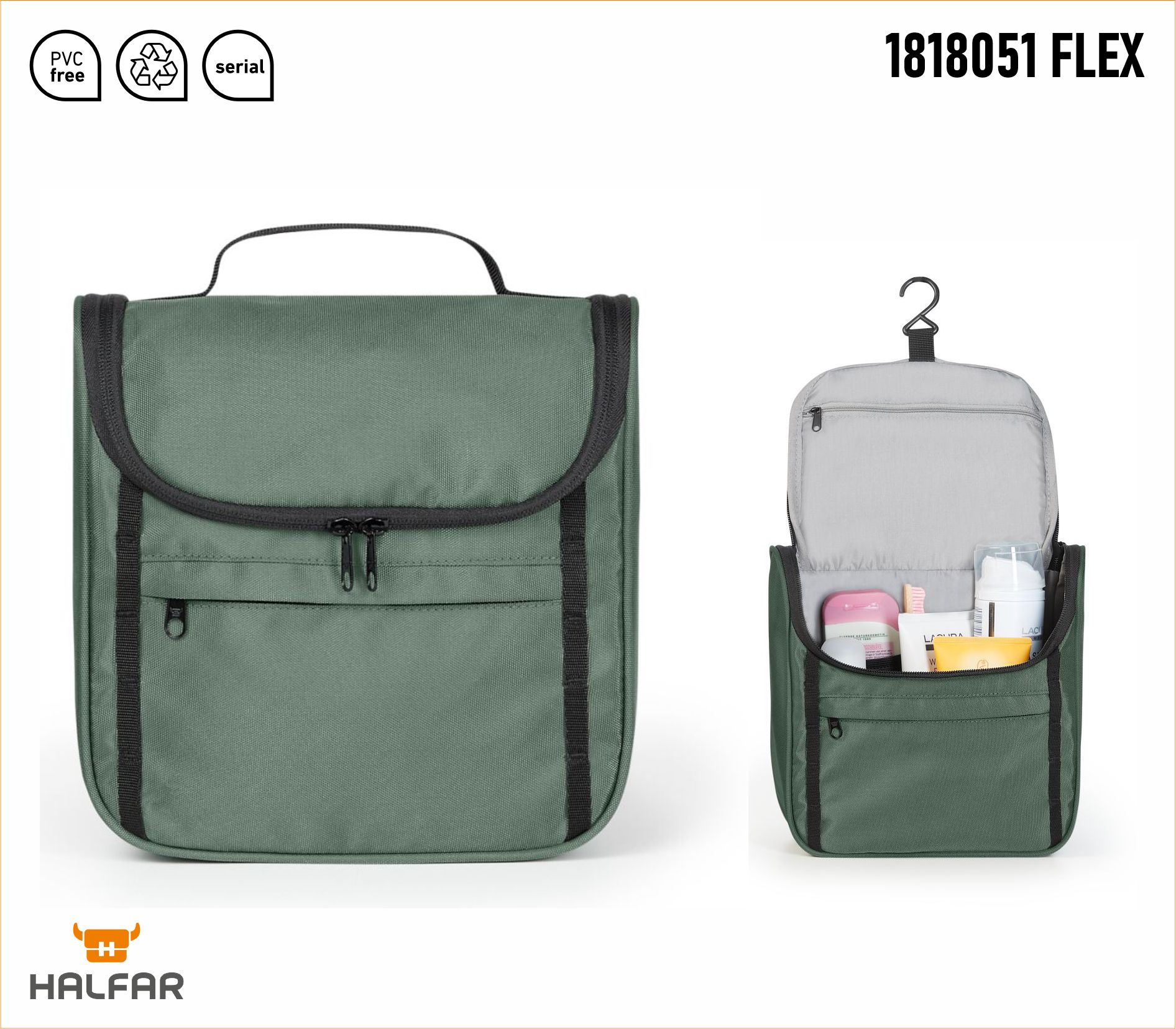 Lekka kosmetyczka z błyszczącym materiałem zewnętrznym pochodzącym z recyklingu i szarą podszewką również wygląda naprawdę dobrze - niezależnie od tego, czy stoi, czy wisi na zintegrowanym haczyku.
