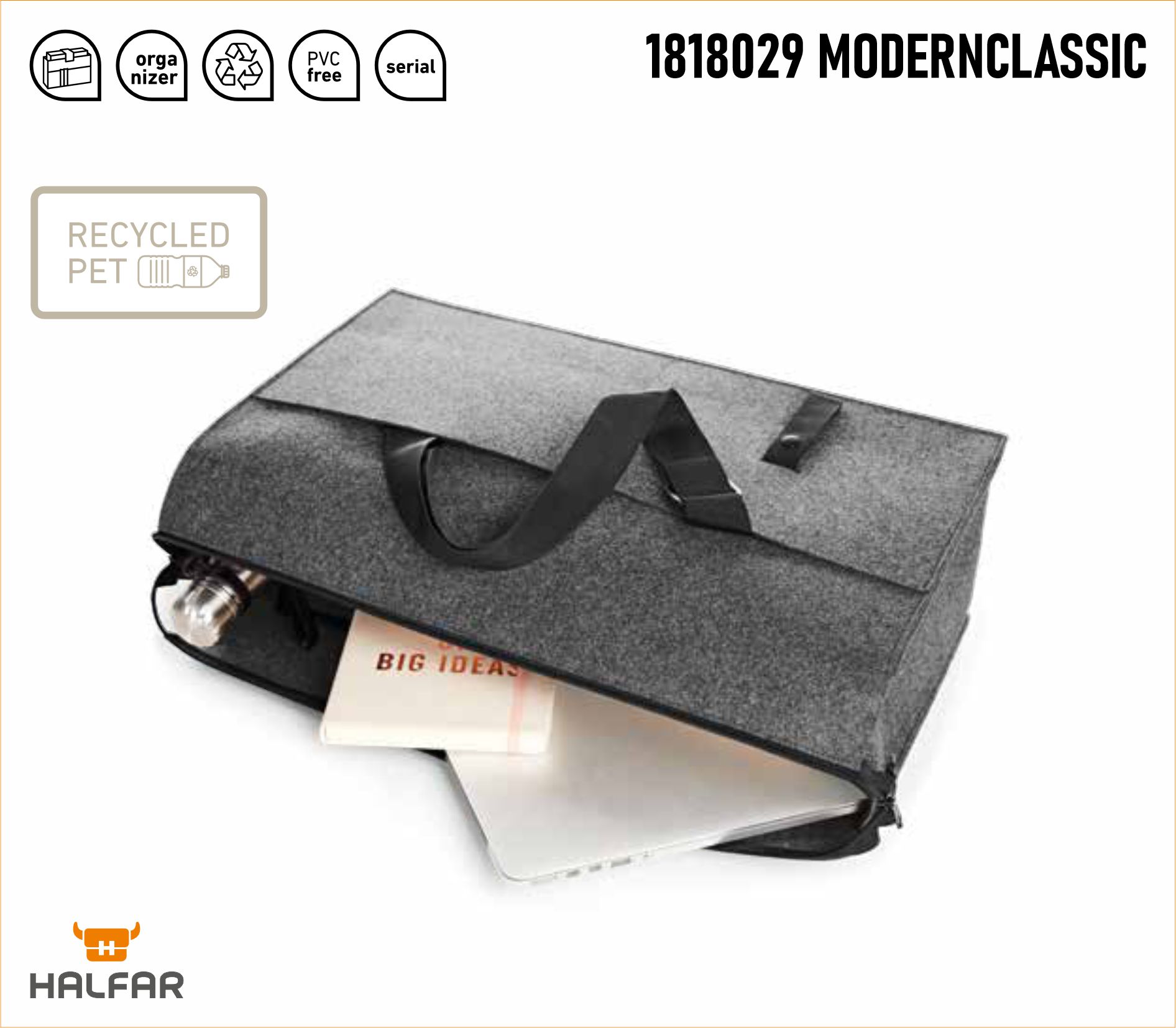 Z dumą prezentujemy: nasz ogromny talent organizacyjny do pracy mobilnej. Wykonane z cudownie ciepłego i zrównoważonego filcu wykonanego z materiału pochodzącego z recyklingu. Pomieści wszystko, czego potrzebujesz do pracy. Oferuje również miejsce na naprawdę szerokie i duże klawiatury, tablety i laptopy. Może być coś więcej? Dodatkowe bocznye przegródki pomieszczą termos, kubek do kawy. A jeśli udasz się na kolejne spotkanie lub do biura samochodem, stanie się inteligentnym pasażerem dzięki pętli do wpięcia pasów bezpieczeństwa. Materiał: filc z recyklingu Rozmiar: 50x27x16 cm Pakowanie: 20 szt./karton Specyfikacja: neutralna pod względem emisji CO2; nie zawiera PVC; bogato wyposażony organizer; duża komora główna zamykana na 2-kierunkowy zamek błyskawiczny; płaska kieszeń, duża kieszeń na zamek błyskawiczny, dwie pętle mocujące na przykład na butelkę napoju; przegródka na wizytówki; trzy kieszenie wewnątrz; trzy kieszenie na zewnątrz; paski nośne o regulowanej długości; pętelka do przypięcia torby pasem bezpieczeństwa; |