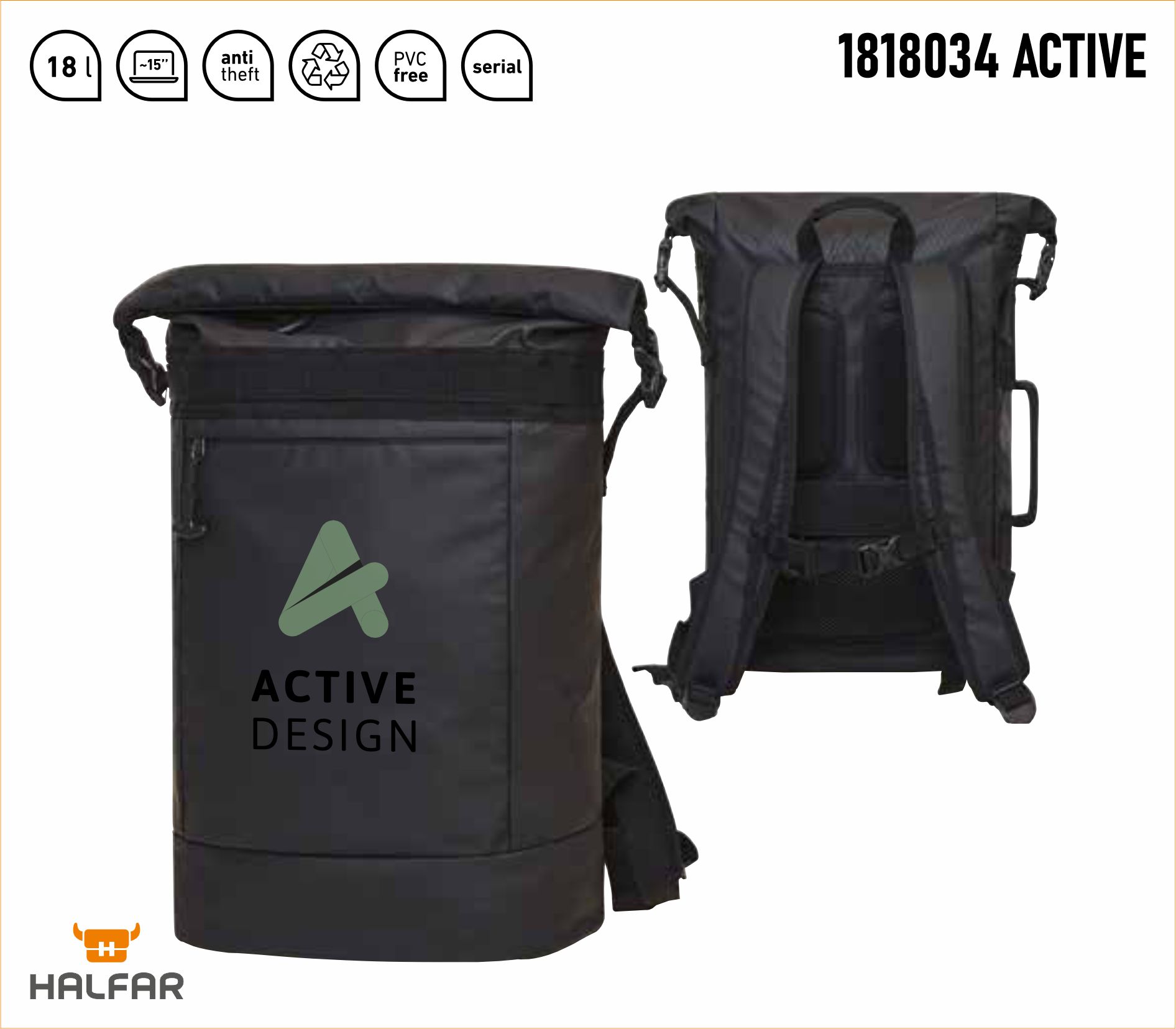Materiał: rPET 600d Rozmiar: 29x41x15 cm Pakowanie: 20 szt./karton Specyfikacja: 3 lata gwarancji materiał z recyklingu; misternie wykonany plecak roll-top; zapinana na zamek komora główna z bocznymi klamrami; wyściełana wsuwana kieszeń wewnątrz; duża przednia kieszeń zapinana na zamek; funkcjonalny pasek z przodu; pętla mocująca do uchwytu wwalizki z tyłu; ukryta komora zapinana na zamek; wyściełany system nośny z paskiem na klatkę piersiową o regulowanej wysokości; uchwyt; pojemność 18l