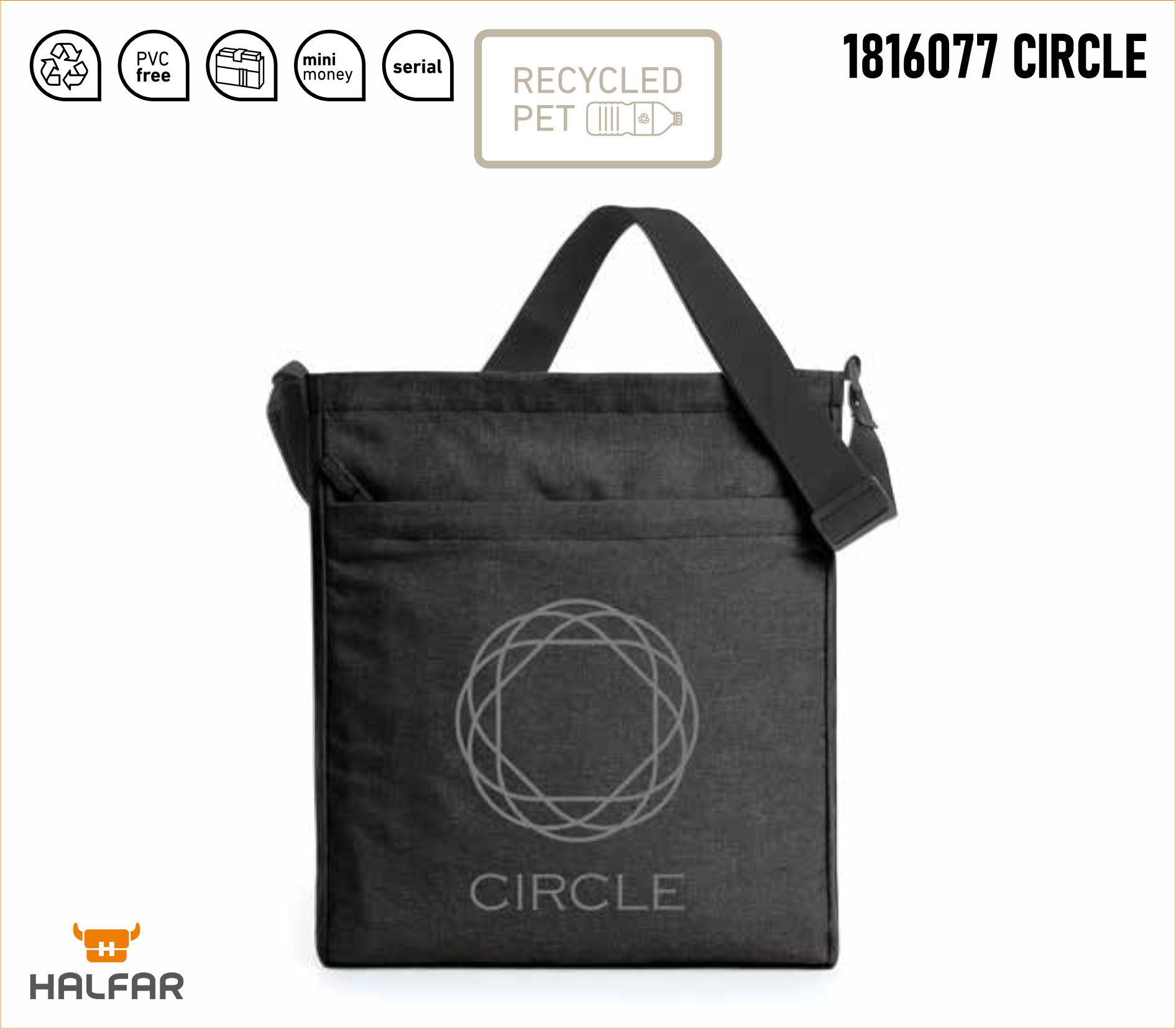 Materiał: rPET 300d Rozmiar: 32x38x7 cm Pakowanie: 50 szt./karton Specyfikacja: nowoczesna torba na ramię; materiał wierzchni wykonany z przetworzonych butelek PET; przestronna główna komora zapinana na zamek; zewnętrzna kieszeń z ukrytym zamkiem; regulowany pasek
