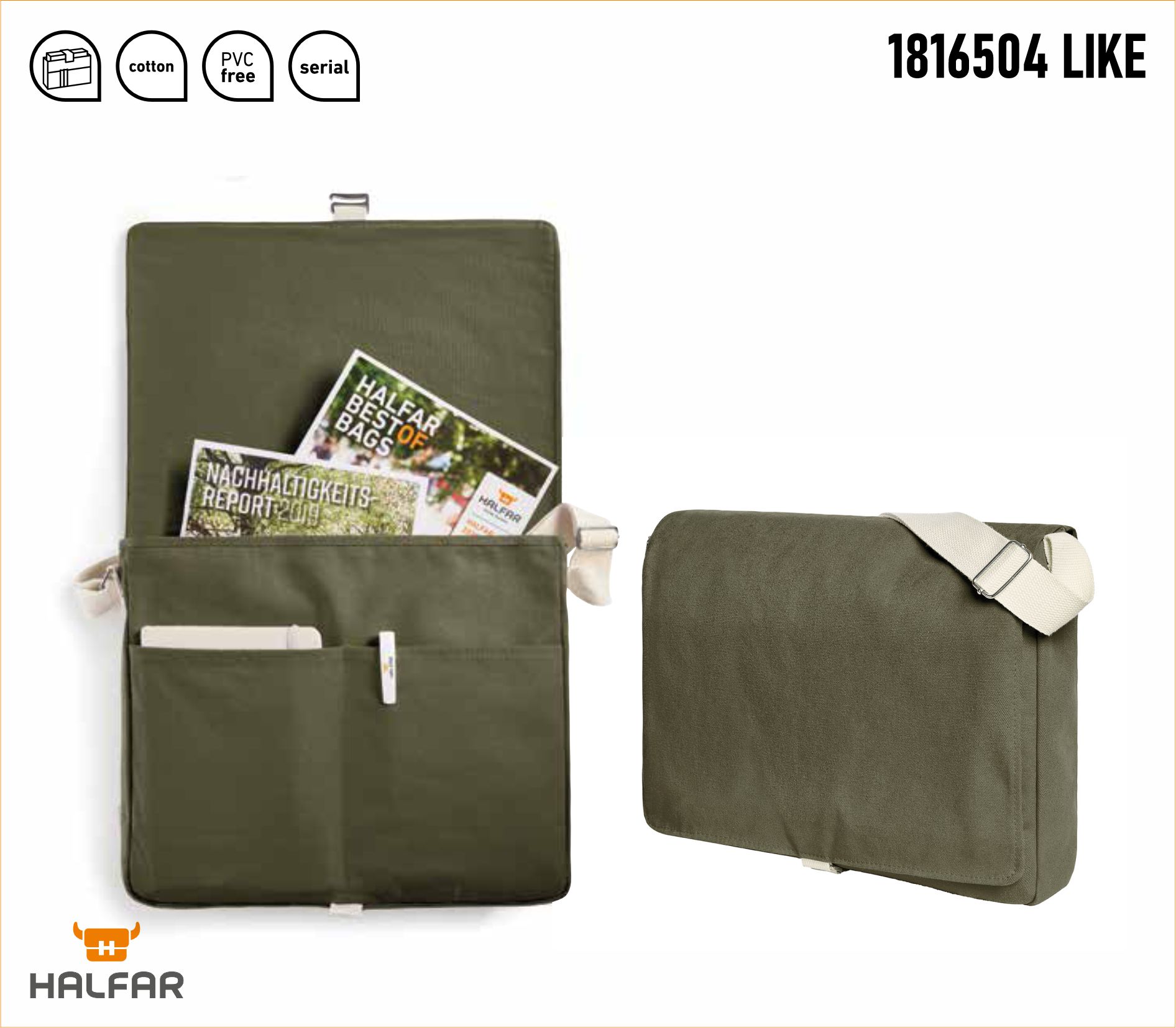 Materiał: bawełna 12 OZ (340 g/m2) Rozmiar: 37x31x7 cm Pakowanie: 25 szt./karton Specyfikacja: kieszeń z klapką z wysokiej jakości metalowymi dodatkami; zapięcie na klips; duża komora główna na dokumenty A4; dwie płaskie kieszenie z przodu; tylna pętla do mocowania na walizce - może służyć również jako rączka; szeroki, regulowany bawełniany pasek na ramię