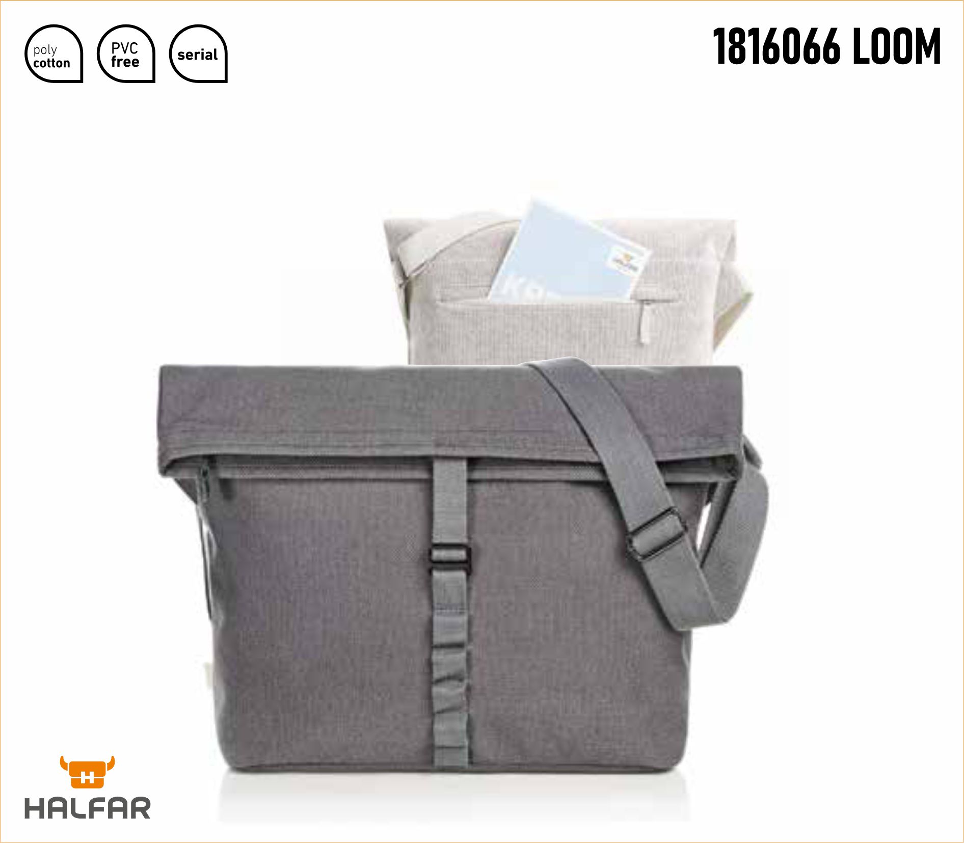 Materiał: bawełna/poliester Rozmiar:35x30x13 cm Pakowanie: 25 szt./karton Specyfikacja: duża główna komora zapinana na zamek z wyściełanym tyłem i metalowym zapięciem; wyściełana podstawa; płaska kieszeń; zapinana na zamek kieszeń z tyłu; regulowany pasek na ramię; wysokiej jakości metalowe akcesoria